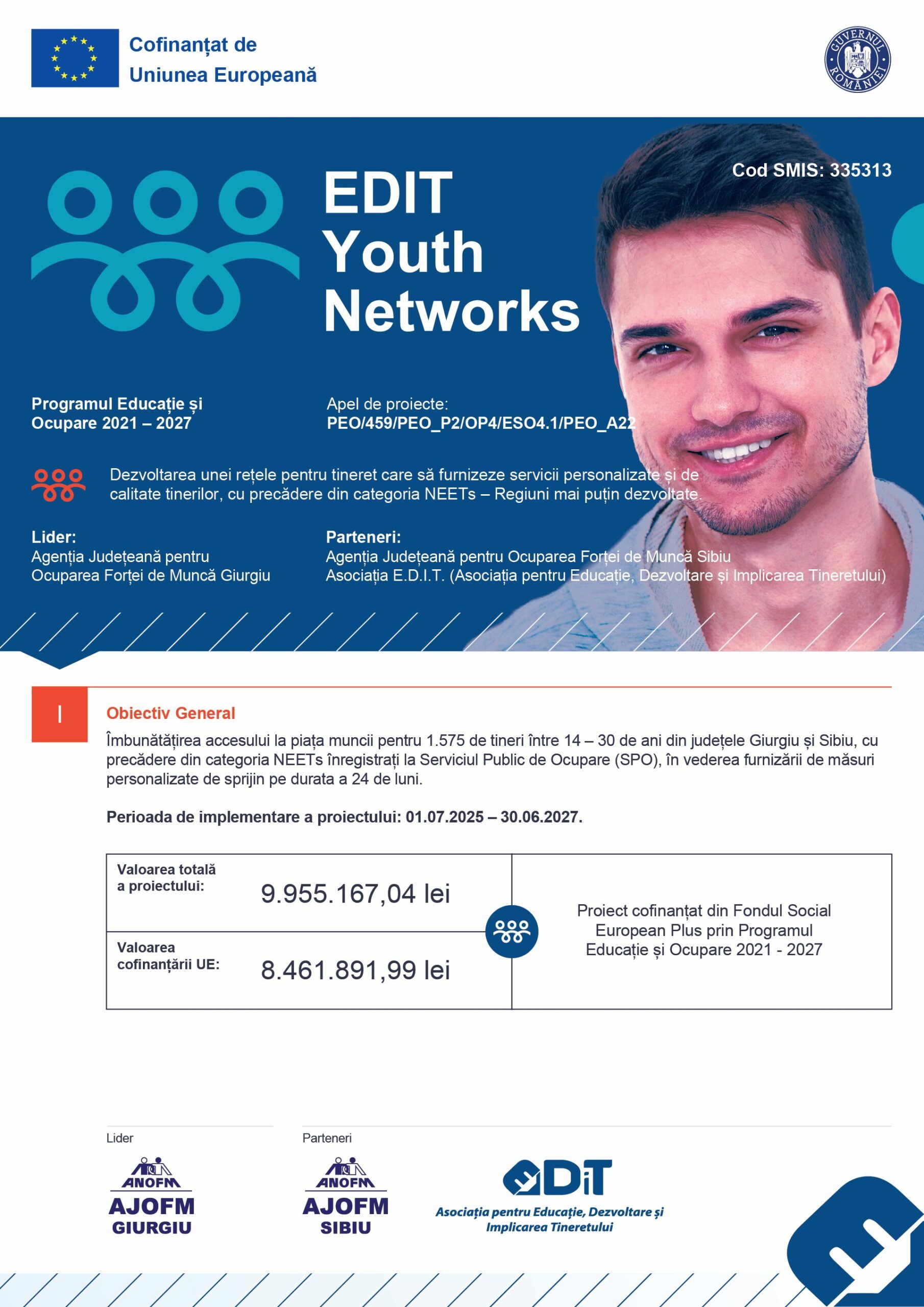 EDIT Youth Networks (ID MySMIS 335313) este un proiect cofinanțat din Fondul Social European Plus, prin Programul Educație și Ocupare 2021–2027 (Prioritatea P02, Obiectiv specific ESO4.1).